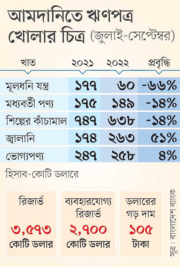 ঋণপত্র খোলার ক্ষেত্রে কোনো অগ্রাধিকার তালিকা নেই বাণিজ্য মন্ত্রণালয় ও বাংলাদেশ ব্যাংকের। ফলে শিল্পের মূলধনি যন্ত্র, কাঁচামাল, খাদ্যসহ অতিগুরুত্বপূর্ণ অনেক আমদানি কমে গেছে। শিল্পের মূলধনি যন্ত্র ও কাঁচামাল আমদানি কমে গেলে অর্থনীতির গতি কমে আসে। প্রভাব পড়ে বিনিয়োগ, কর্মসংস্থান ও রাজস্ব আদায়ে। খাদ্য আমদানি কমে গেলে দাম বেড়ে যায়। সবকিছুই এখন ঘটছে অর্থনীতিতে। গত জুলাই-অক্টোবর সময়েই গম, চাল ও ডাল আমদানি কমেছে ৯ লাখ টন।