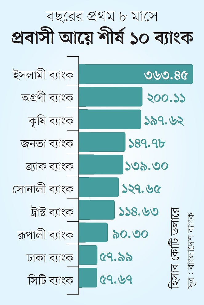 গত জানুয়ারি থেকে আগস্ট পর্যন্ত দেশে আসা ২১ দশমিক ৪৫ বিলিয়ন ডলার প্রবাসী আয়ের মধ্যে উল্লিখিত পাঁচ ব্যাংক মিলে এনেছে সাড়ে ১০ বিলিয়ন বা ১ হাজার ৫০ কোটি ডলার। এর মধ্যে রাষ্ট্রমালিকানাধীন তিন ব্যাংক এনেছে ৫ দশমিক ৪৬ বিলিয়ন বা ৫৪৬ কোটি ডলার। সে হিসাবে গত আট মাসে দেশে আসা প্রবাসী আয়ের ২৫ শতাংশ বা এক–চতুর্থাংশ এনেছে রাষ্ট্রমালিকানাধীন কৃষি, অগ্রণী ও জনতা ব্যাংক।