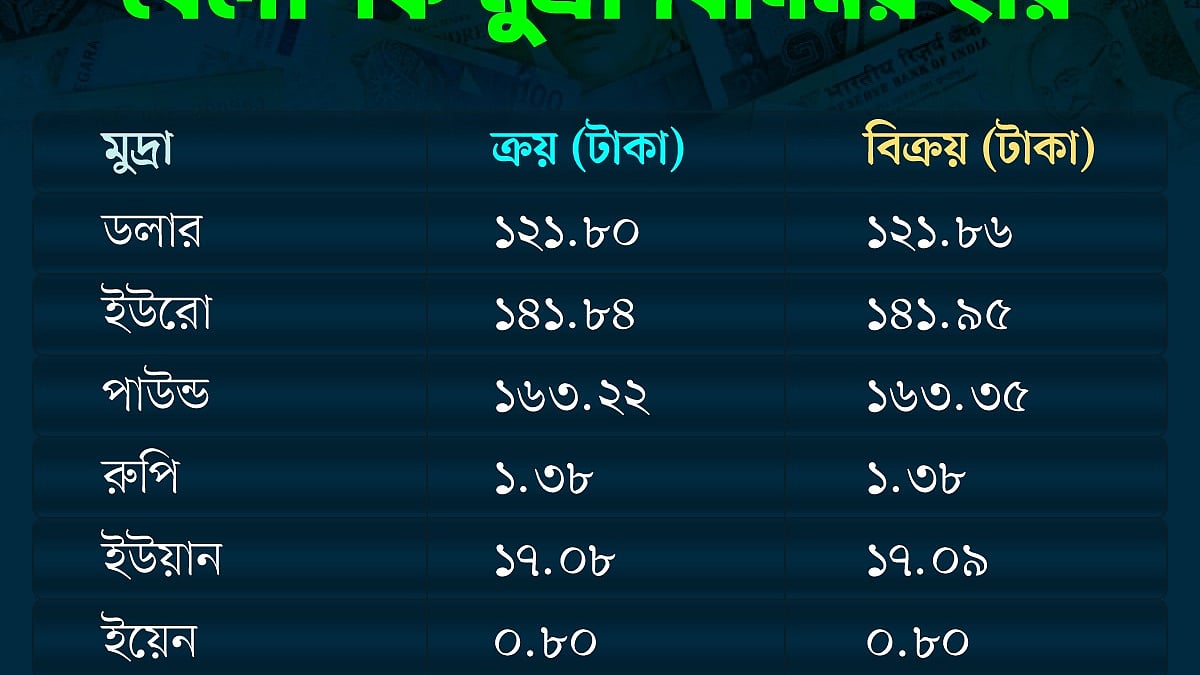 আজ দেশের মুদ্রাবাজারে বেশির ভাগ মুদ্রার দাম বেড়েছে। সেই তালিকায় আছে ইউরো, পাউন্ড, রুপি, ইউয়ান, অস্ট্রেলীয় ডলার ও সিঙ্গাপুরি ডলার। আজ কোনো মুদ্রার দাম কমেনি। দাম অপরিবর্তিত আছে কেবল ইয়েনের।