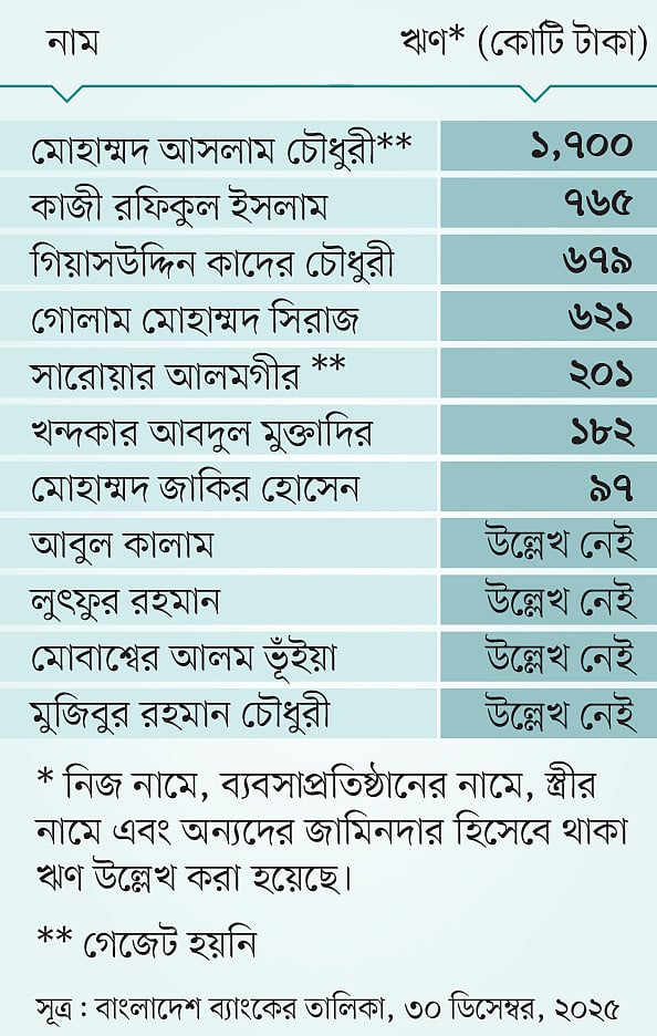 চট্টগ্রাম-৬ (রাউজান) আসন থেকে বিজয়ী বিএনপির সংসদ সদস্য গিয়াসউদ্দিন কাদের চৌধুরীর নামে ৬৭৯ কোটি ৩৮ লাখ টাকার খেলাপি ঋণ ছিল। তাঁকে ঋণখেলাপি দেখানোর ওপর আদালতের স্থগিতাদেশ ছিল গত ২৩ ফেব্রুয়ারি পর্যন্ত (নির্বাচনের পর ১১ দিন)।