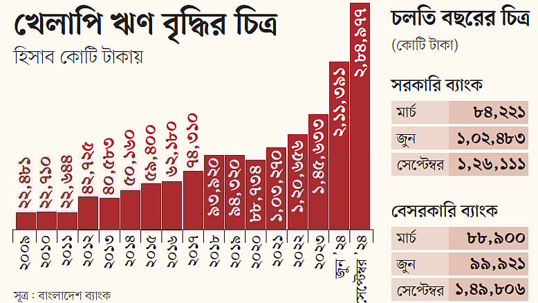 বাংলাদেশ ব্যাংকের তথ্য অনুযায়ী, ২০২৩ সাল শেষে ব্যাংক খাতের খেলাপি ঋণ ছিল ১ লাখ ৪৫ হাজার ৬৩৩ কোটি টাকা। গত জুন শেষে যা বেড়ে হয় ২ লাখ ১১ হাজার ৩৯১ কোটি টাকা। তখন দেশের ব্যাংকগুলো থেকে বিতরণ করা ঋণের ১২ দশমিক ৫৬ শতাংশই খেলাপি ছিল। গত সেপ্টেম্বর শেষে সেই খেলাপি ঋণ বেড়ে এখন প্রায় ৩ লাখ কোটি টাকা হয়ে গেছে। অথচ ২০০৯ সালে আওয়ামী লীগ যখন সরকার গঠন করে, তখন মোট খেলাপি ঋণ ছিল ২২ হাজার ৪৮১ কোটি টাকা।