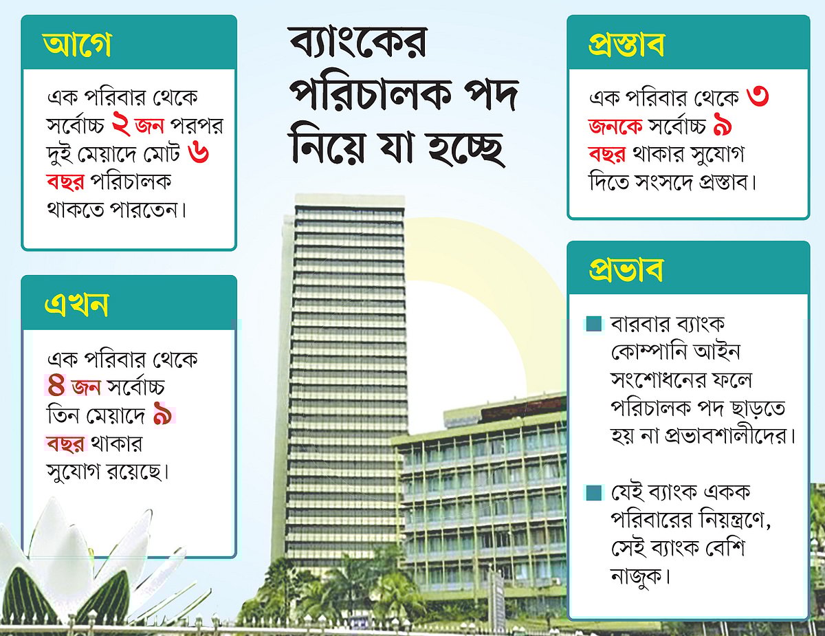 বেসরকারি ব্যাংকে এখন এক পরিবারের চারজন সদস্য টানা ৯ বছর পরিচালক থাকতে পারেন। এ মাধ্যমে ব্যাংকগুলোতে পরিবারতন্ত্র কায়েম হয়েছে বলে ব্যাপক সমালোচনা রয়েছে। এ সমালোচনার মুখে এখন এক পরিবার থেকে চারজনের বদলে তিনজন পরিচালক রাখার বিধান করা হচ্ছে। এ জন্য ব্যাংক কোম্পানি আইন সংশোধন করা হচ্ছে। গতকাল বৃহস্পতিবার জাতীয় সংসদে এই আইন সংশোধনীর জন্য উঠেছে।