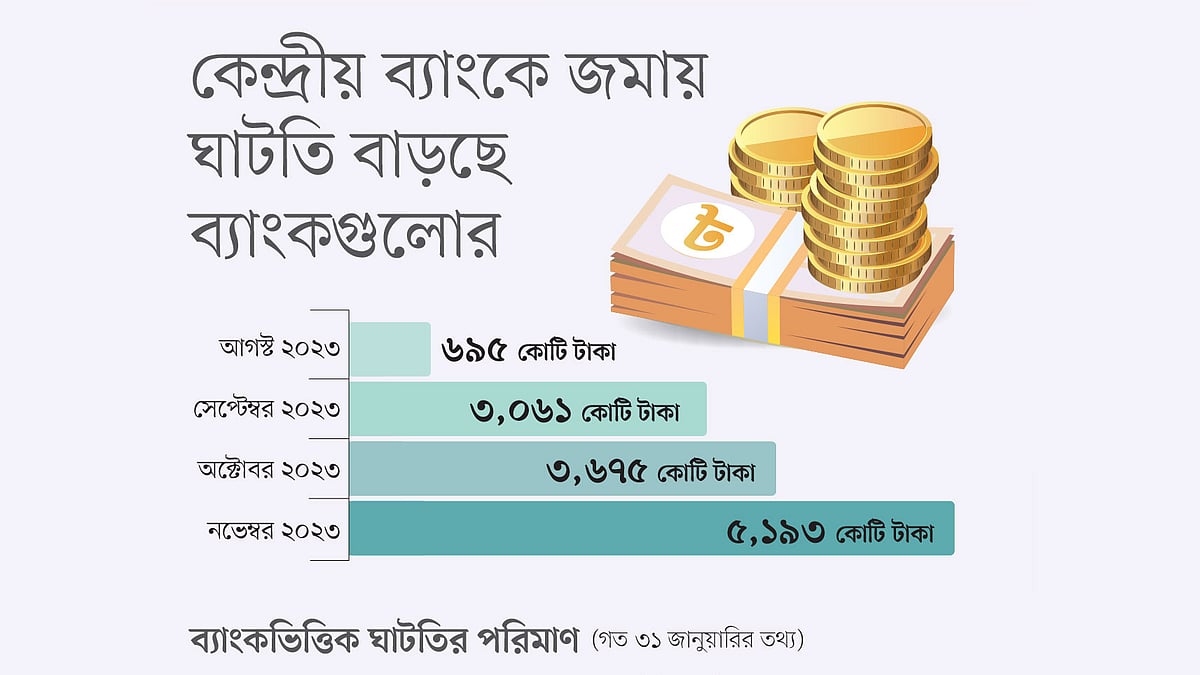 বাংলাদেশ ব্যাংক প্রতি মাসে অর্থনীতির হালচাল নিয়ে প্রতিবেদন প্রকাশ করে। সেই প্রতিবেদনের তথ্য অনুযায়ী, ২০২২ সালের ডিসেম্বরে ব্যাংকগুলোর অতিরিক্ত ২২ হাজার ৩৭১ কোটি টাকা কেন্দ্রীয় ব্যাংকে জমা ছিল। গত বছরের জুলাইয়ে যা কমে হয় ৫ হাজার ১০০ কোটি টাকা। আগস্ট থেকে পুরো ব্যাংক খাতে ঘাটতি শুরু হয়। ওই মাসে ঘাটতি হয় ৬৯৫ কোটি টাকা। এরপর ক্রমাগত ঘাটতি বাড়তে থাকে। গত নভেম্বরে তা বেড়ে হয় ৫ হাজার ১৯৩ কোটি টাকা। এতে চাপে পড়েছে অন্য ব্যাংকগুলোও।