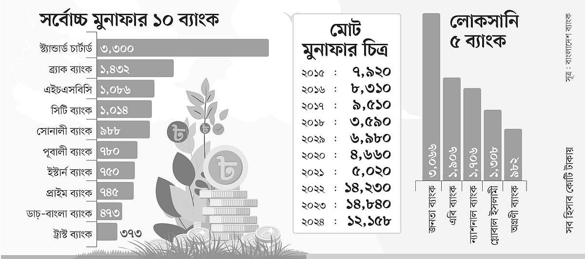 কিছু ব্যাংক বড় লোকসান করলেও আবার কয়েকটি মুনাফা ধরে রাখতে পেরেছে। এর মধ্যে কোনো কোনো ব্যাংক তো রেকর্ড পরিমাণ মুনাফা করে। এ ক্ষেত্রে সবচেয়ে এগিয়ে রয়েছে বিদেশি ব্যাংকগুলো। বহুজাতিক স্ট্যান্ডার্ড চার্টার্ড ব্যাংক গত বছর এককভাবে ৩ হাজার ৩০০ কোটি টাকা মুনাফা করে, যা পুরো ব্যাংক খাতের মধ্যে সর্বোচ্চ। এরপর এইচএসবিসি ব্যাংকও এককভাবে ১ হাজার ৮৬ কোটি টাকা মুনাফা করে। গত বছর বেসরকারি ব্যাংকগুলোর মধ্যে সর্বোচ্চ মুনাফা করে ব্র্যাক ব্যাংক। এটির নিট মুনাফা বেড়ে দাঁড়ায় ১ হাজার ৪৩২ কোটি টাকা, যা ২০২৩ সালে ছিল ৮২৮ কোটি টাকা। সিটি ব্যাংকের মুনাফা ২০২৩ সালের ৬৩৮ কোটি থেকে বেড়ে ২০২৪ সালে ১ হাজার ১৪ কোটি টাকায় ওঠে।