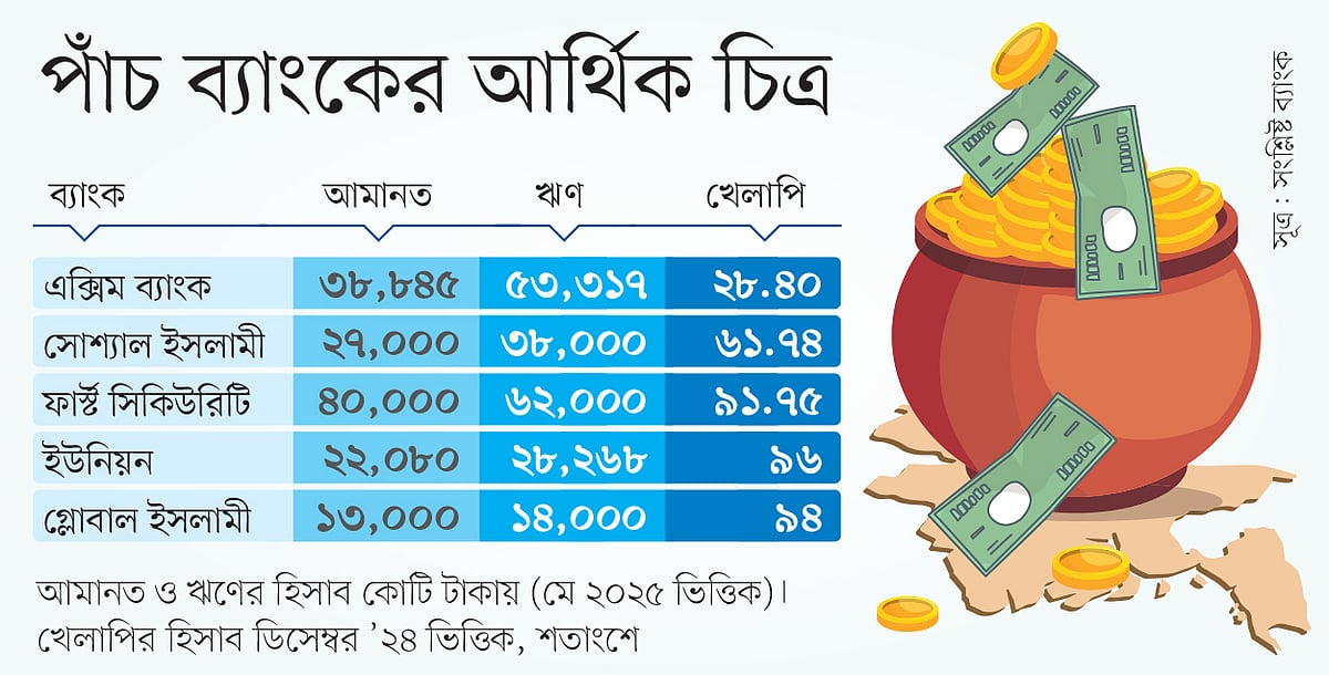 বাংলাদেশ ব্যাংকের তথ্যমতে, গত বছরের ডিসেম্বর শেষে গ্লোবাল ইসলামী ব্যাংকের খেলাপি ছিল ৯৪ শতাংশ, ইউনিয়ন ব্যাংকের ৯৬ শতাংশ, ফার্স্ট সিকিউরিটি ইসলামী ব্যাংকের ৯২ শতাংশ, সোশ্যাল ইসলামী ব্যাংকের ৬২ শতাংশ। সেখানে এক্সিম ব্যাংকের খেলাপির ঋণের হার ২৮ শতাংশ। পুরো ব্যাংক খাতে খেলাপি ঋণের হার গত মার্চ শেষে দাঁড়িয়েছে ২৪ শতাংশে।