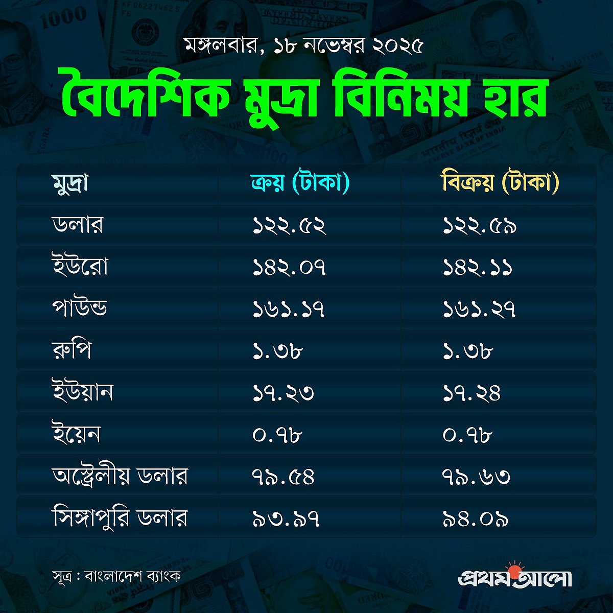 বাংলাদেশ ব্যাংকের তথ্য অনুসারে, আজ ডলারের সর্বোচ্চ দাম ১২২ টাকা ৫৯ পয়সা ও সর্বনিম্ন দাম ১২২ টাকা ৫২ পয়সা। আজ ডলারের গড় দাম ১২২ টাকা ৫৫ পয়সা। গত জুলাই থেকে চলতি নভেম্বর পর্যন্ত ডলারের দাম ওঠানামা করছে।