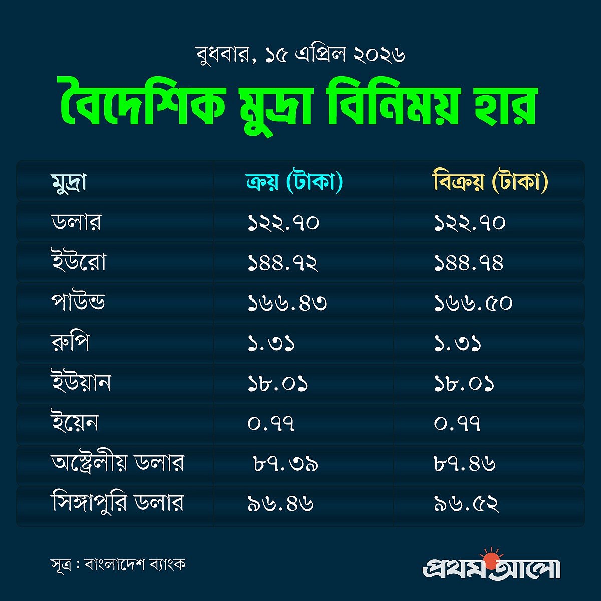 আজ বুধবার সপ্তাহের তৃতীয় কার্যদিবসে (মঙ্গলবার সরকারি ছুটি ছিল) দেশের মুদ্রাবাজারে লেনদেন চলছে। মধ্যপ্রাচ্য সংকটসহ বিভিন্ন কারণে কয়েক দিন ধরেই বিদেশি মুদ্রার দাম ওঠানামা করছে, তবে দামের বাড়তি প্রবণতা বেশি।
