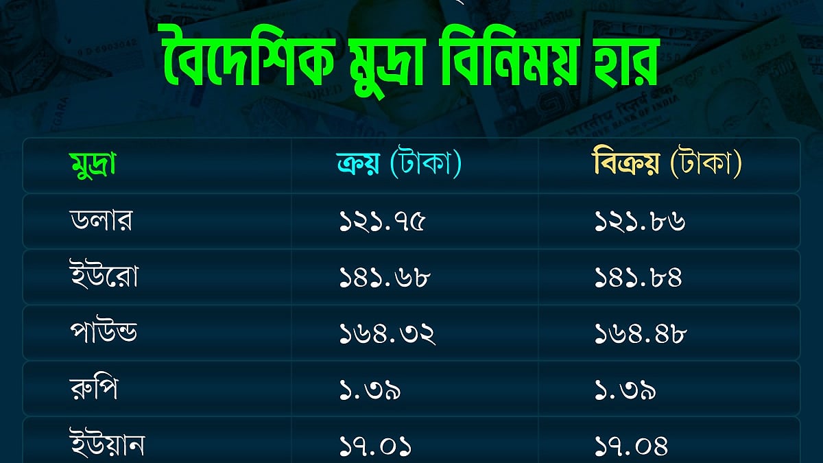 বাংলাদেশ ব্যাংকের তথ্যানুসারে, আজ ডলারের সর্বোচ্চ দাম ১২১ দশমিক ৮৬ টাকা ও সর্বনিম্ন ১২১ দশমিক ৭৫ টাকা। আজ ডলারের গড় দাম ১২১ দশমিক ৭৮ টাকা।