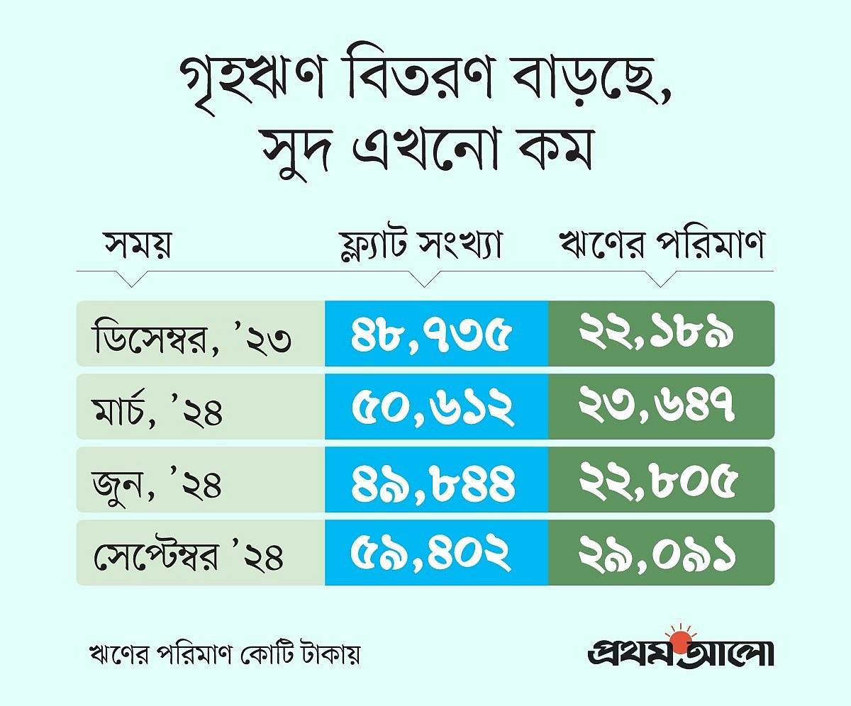 বাংলাদেশ ব্যাংকের তথ্য অনুযায়ী, গত জুনের শেষে ব্যাংকগুলোতে ফ্ল্যাট তথা আবাসন ঋণের গ্রাহক ছিল ৪৯ হাজার ৮৪৪ জন। এর বিপরীতে ঋণের স্থিতি ছিল ২২ হাজার ৮০৫ কোটি টাকা। সেপ্টেম্বর শেষে গ্রাহক বেড়ে হয়েছে ৫৯ হাজার ৪০২ কোটি জন। আর ঋণের স্থিতি বেড়ে ২৯ হাজার ৯১ কোটি টাকা। অর্থাৎ তিন মাসে গ্রাহক বেড়েছে ৯ হাজার ৫৫৮ জন, ঋণ বৃদ্ধি পেয়েছে ৬ হাজার ২৮৬ টাকা।