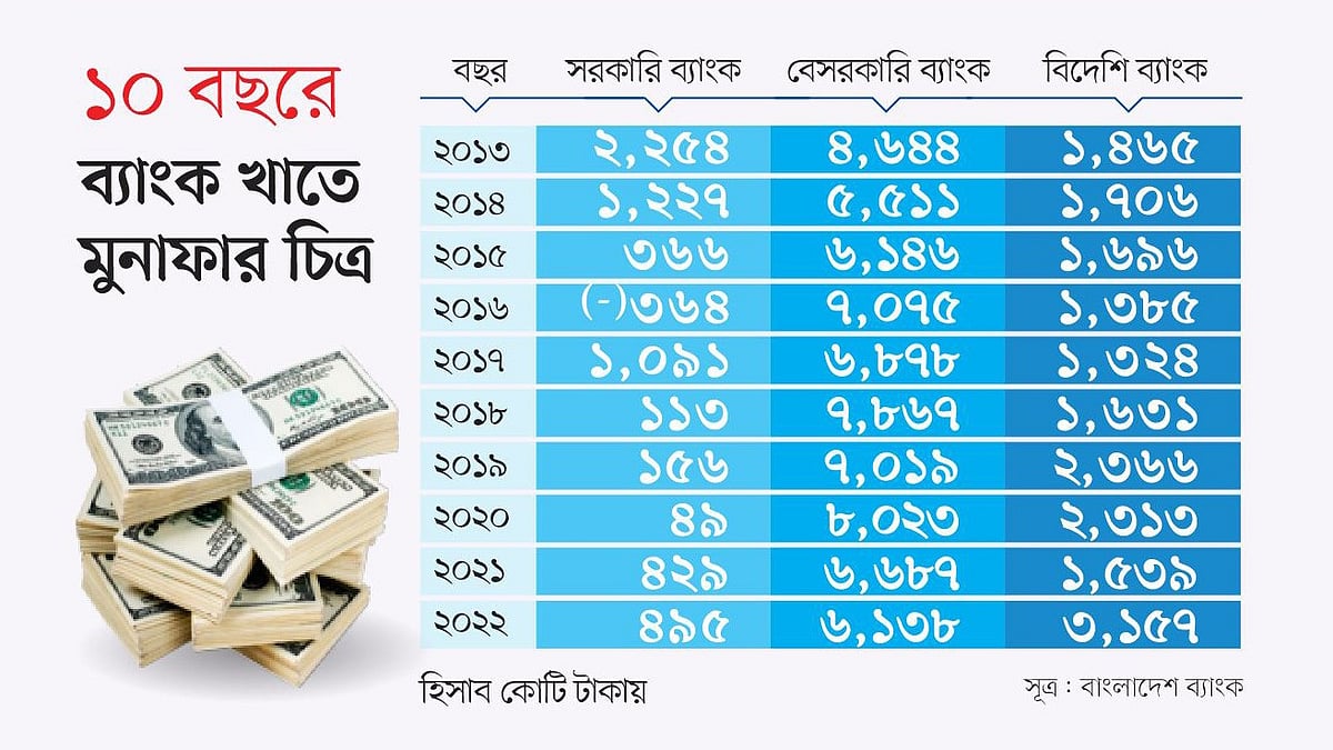 বাংলাদেশ ব্যাংকের তথ্য অনুযায়ী, ২০১৩ সালের শেষে রাষ্ট্রমালিকানাধীন ব্যাংকগুলোর কর–পরবর্তী সম্মিলিত মুনাফার পরিমাণ ছিল ২ হাজার ২৫৮ কোটি টাকা, যা ১০ বছর পরে ২০২২ সালের শেষে কমে হয়েছে ৪৯৫ কোটি টাকায়। ২০১৩ সালে দেশি মালিকানাধীন বেসরকারি ব্যাংকগুলো কর–পরবর্তী মোট মুনাফা করেছিল ৩ হাজার ৯৬৩ কোটি টাকা। গত বছর শেষে তা প্রায় দেড় গুণ বেড়ে ৬ হাজার ১৩৮ কোটি টাকায় ওঠে।