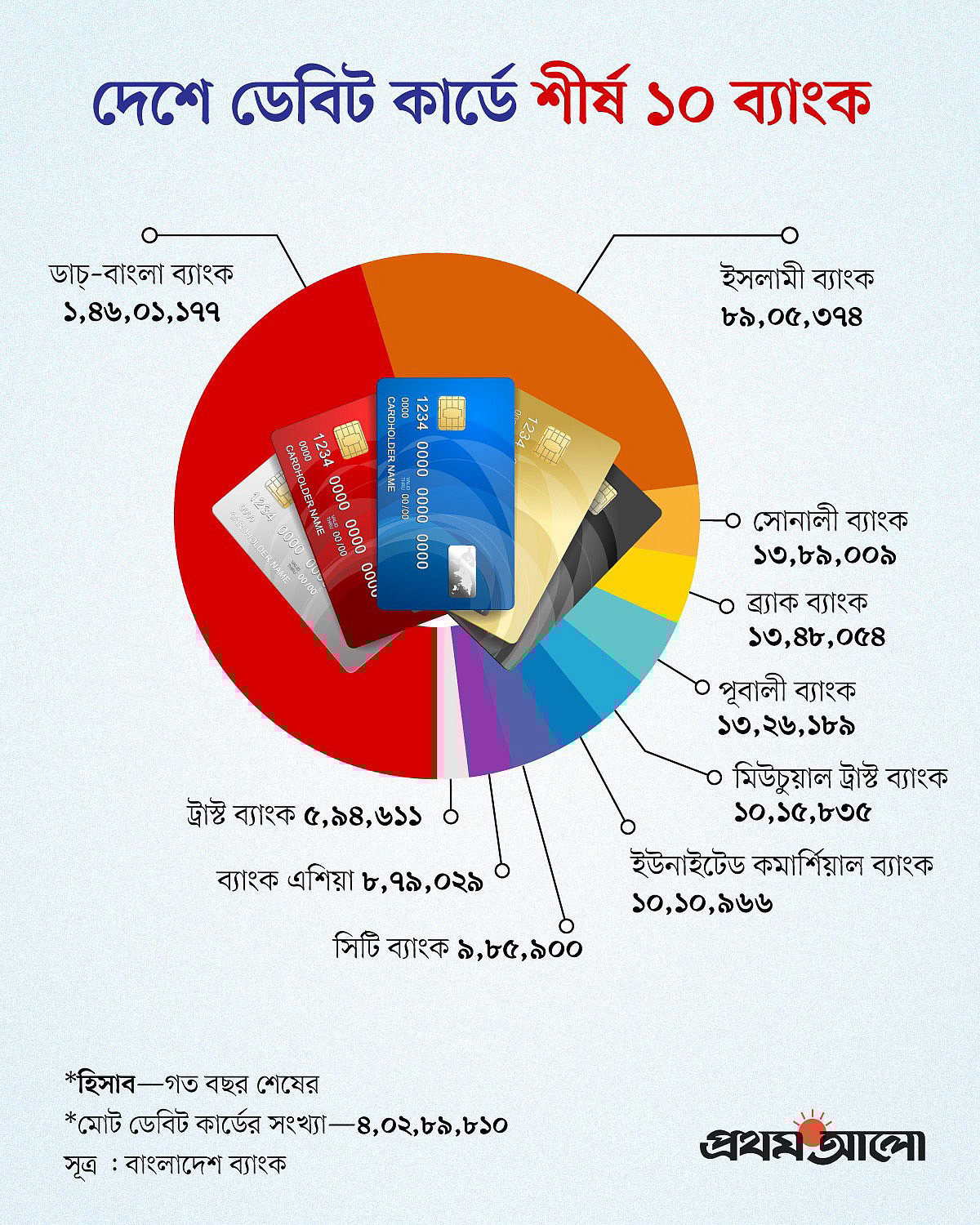 বাংলাদেশ ব্যাংকের তথ্য অনুযায়ী, গত বছর শেষে সরকারি, বেসরকারি ও বিদেশি ৬১টি ব্যাংকের ইস্যু করা মোট ডেবিট কার্ডের সংখ্যা ছিল ৪ কোটি ২ লাখ ৮৯ হাজার ৮১০টি। এর মধ্যে শীর্ষ পাঁচ ব্যাংকেরই রয়েছে ২ কোটি ৭৫ লাখ ৬৯ হাজার ৮০৩টি, যা মোট ডেবিট কার্ডের প্রায় ৬৮ শতাংশ। অর্থাৎ দেশের ব্যাংকগুলোর গ্রাহকদের মধ্যে ডেবিট কার্ড ব্যবহারকারীদের প্রায় তিন–চতুর্থাংশই পাঁচ ব্যাংকের।