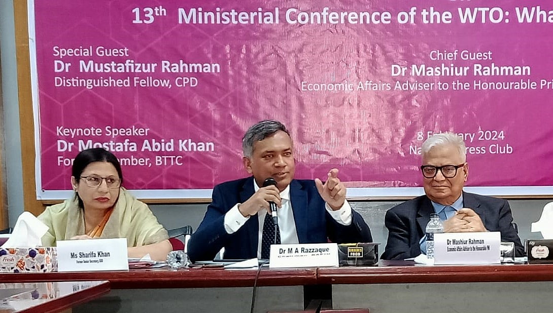রাজধানীর জাতীয় প্রেসক্লাবে গতকাল বৃহস্পতিবার অনুষ্ঠিত এই সভায় প্রধান অতিথি ছিলেন প্রধানমন্ত্রীর অর্থনীতিবিষয়ক উপদেষ্টা মসিউর রহমান। এতে মূল প্রবন্ধ উপস্থাপন করেন বাংলাদেশ ট্রেড অ্যান্ড ট্যারিফ কমিশনের সাবেক সদস্য মোস্তফা আবিদ খান।