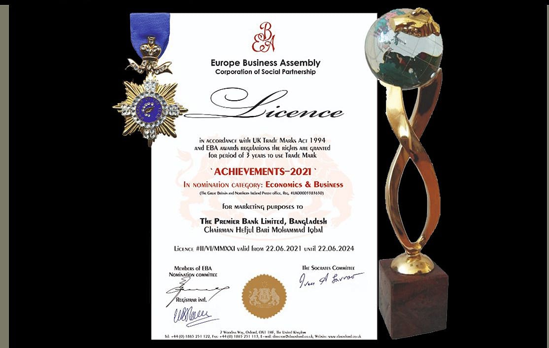 অর্থনীতি ও বাণিজ্য বিভাগে যুক্তরাজ্যের সম্মানজনক ‘টপ ১০০ অ্যাচিভমেন্টস অ্যাওয়ার্ড’ পেয়েছে প্রিমিয়ার ব্যাংক লিমিটেড। ইউরোপ বিজনেস অ্যাসেম্বলি, ইবিএর দ্য অক্সফোর্ড কমিটি সম্প্রতি এ পুরস্কার প্রদান করেছে।