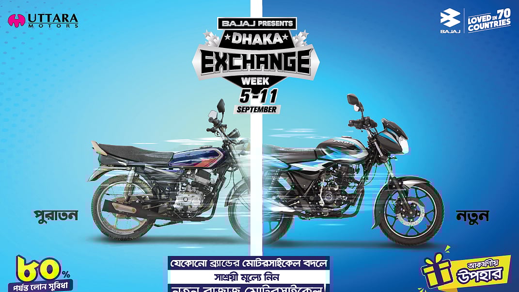 এই প্রথম বাজাজ আয়োজন করেছে ‘ঢাকা এক্সচেঞ্জ উইক’। ৫ থেকে ১১ সেপ্টেম্বর পর্যন্ত সপ্তাহজুড়ে উত্তরা মোটরসের অনুমোদিত নির্দিষ্ট ১৬টি পরিবেশকের বিক্রয়কেন্দ্রে একযোগে চলবে ঢাকা এক্সচেঞ্জ উইক। এই এক্সচেঞ্জ অফারে গ্রাহকেরা তাঁদের যেকোনো ব্র্যান্ডের পুরোনো মোটরসাইকেল বিনিময় করার সঙ্গে অল্প কিছু টাকা যোগ করে সহজেই নতুন বাজাজ মোটরসাইকেল নিতে পারবেন।