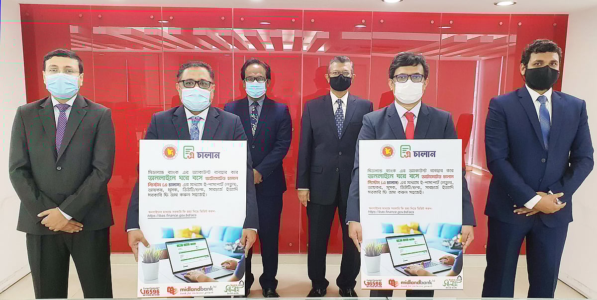 ১৫ সেপ্টেম্বর গুলশানে ব্যাংকের প্রধান কার্যালয়ের বোর্ড রুমে এক সংক্ষিপ্ত অনুষ্ঠানে অনলাইনে এ-চালানের সেবা কার্যক্রম আনুষ্ঠানিকভাবে উদ্বোধন করা হয়। অনুষ্ঠানে ব্যাংকের ব্যবস্থাপনা পরিচালক ও প্রধান নির্বাহী কর্মকর্তা মো. আহসান-উজ জামান বলেন, মিডল্যান্ড ব্যাংক সব সময় ডিজিটাল ব্যাংকিং সেবা প্রদানের ক্ষেত্রে অগ্রণী ভূমিকা পালন করছে। এরই ধারাবাহিকতায় ব্যাংক তার গ্রাহকদের জন্য বাড়ি বা অফিস থেকে একটি কম্পিউটার ব্যবহার করে অনলাইনে ই-পাসপোর্ট ফি, সরকারি কর ও ভ্যাট সহজেই প্রদানের ব্যবস্থা করছে, যা ব্যাংকের ডিজিটাল ব্যাংকিং সেবার সম্ভারকে আরও প্রসারিত করেছে। তিনি পাসপোর্ট কর্তৃপক্ষ ও এনবিআরকে মিডল্যান্ড ব্যাংককে এ ধরনের ফি আদায়ের অনুমতি দেওয়ার জন্য ধন্যবাদ জানান।