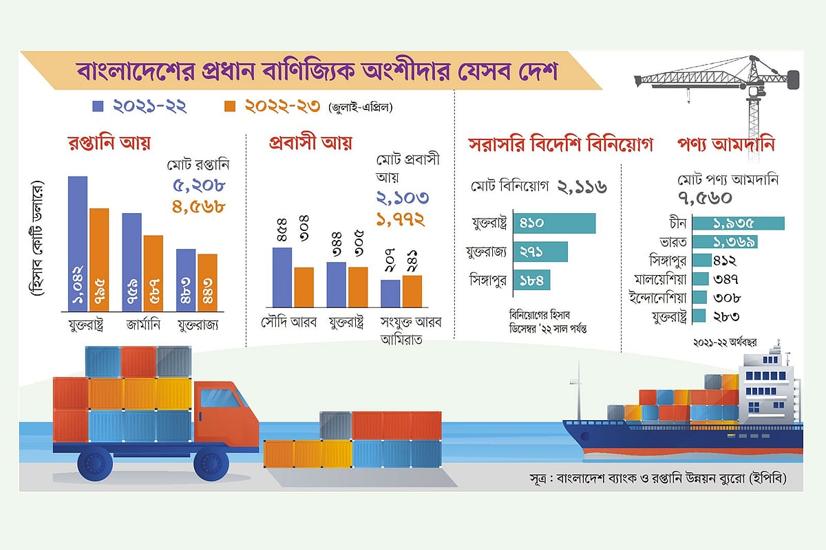 বাংলাদেশ মূলত আমদানিনির্ভর দেশ। এখানে রপ্তানি আয়ের তুলনায় আমদানি ব্যয় অনেক বেশি। বাংলাদেশ মোট আমদানির প্রায় অর্ধেক করে চীন ও ভারত থেকে। ফলে যে বাণিজ্যঘাটতি হয়, তা পূরণ করতে হয় মূলত প্রবাসী আয় দিয়েই। রপ্তানি ও প্রবাসী আয় ছাড়াও দেশের বৈদেশিক মুদ্রা আয়ের আর দুটি উৎস হচ্ছে বৈদেশিক বিনিয়োগ ও ঋণ। এই বৈদেশিক প্রত্যক্ষ বিনিয়োগের (এফডিআই) ক্ষেত্রেও শীর্ষ স্থানে যুক্তরাষ্ট্র।