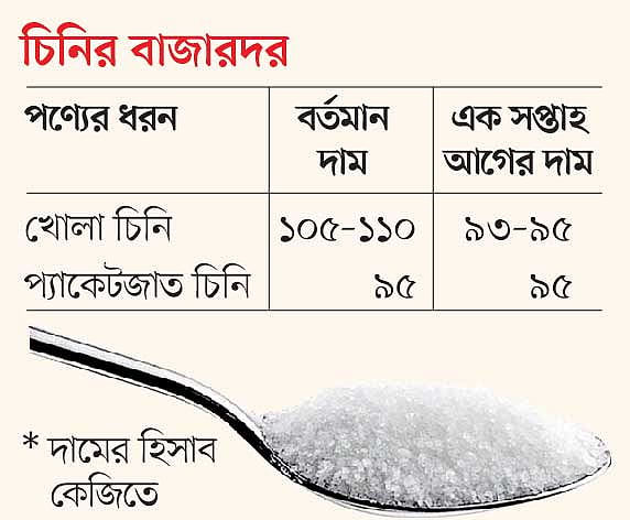 গতকাল শনিবার পাইকারি ও খুচরা চিনির ব্যবসায়ী, ভোক্তা ও সংশ্লিষ্ট ব্যক্তিদের সঙ্গে কথা বলে জানা গেছে, বাজারে এখন প্রতি কেজি খোলা চিনি বিক্রি হচ্ছে ১০৫ থেকে ১১০ টাকায়। দুদিন আগে, বৃহস্পতিবার ১০০ টাকার ওপরে উঠেছিল। তাতে দুদিনের ব্যবধানে কেজিপ্রতি বেড়েছে ৫ থেকে ১০ টাকা; আর সপ্তাহ ব্যবধানে বাড়ল ১৫ থেকে ২০ টাকা।