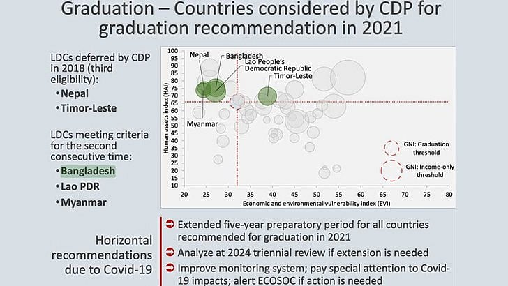 সিডিপি পরপর দুটি ত্রিবার্ষিক মূল্যায়নে এসব মান অর্জন করলেই এলডিসি থেকে বের হওয়ার চূড়ান্ত সুপারিশ করে সিডিপি। সিডিপির সুপারিশ প্রথমে জাতিসংঘের ইকোসকে যায়। তিন বছর পরে তা জাতিসংঘের সাধারণ অধিবেশনে অনুমোদনের জন্য ওঠে। কিন্তু করোনার কারণে বাংলাদেশ বাড়তি আরও দুই বছর সময় পেল। সবকিছু ঠিক থাকলে ২০২৬ সালে এলডিসি থেকে বের হবে বাংলাদেশ।