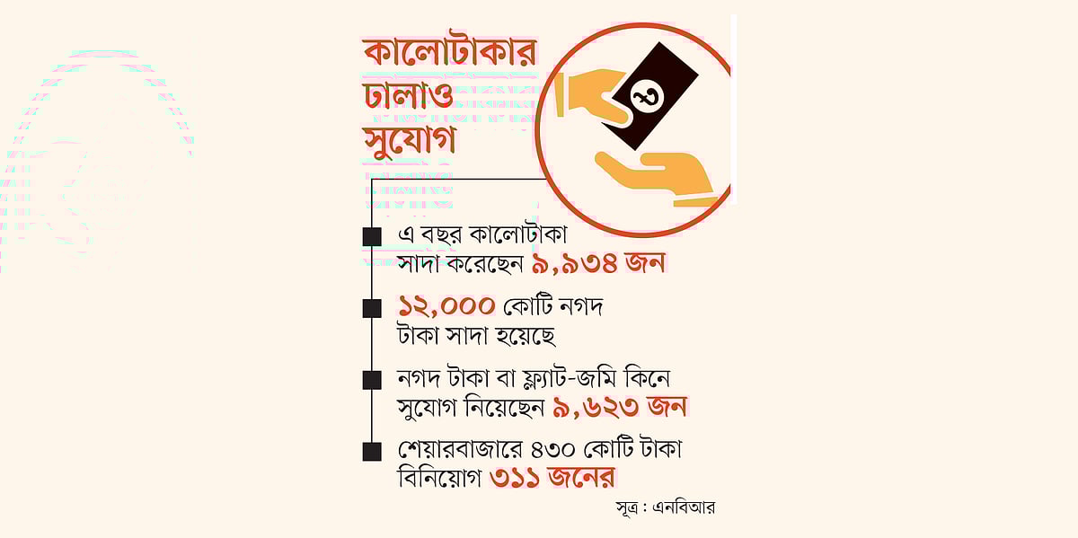 জাতীয় রাজস্ব বোর্ড (এনবিআর) সূত্রে জানা যায়, গত জুলাই থেকে ফেব্রুয়ারি মাসের মধ্যে শেয়ারবাজার, নগদ টাকা কিংবা জমি-ফ্ল্যাট কিনে সব মিলিয়ে ৯ হাজার ৯৩৪ জন কালোটাকা সাদা করেছেন। তাঁদের মধ্যে জমি-ফ্ল্যাট কিনে কিংবা নগদ টাকা সাদা করেছেন ৯ হাজার ৬২৩ জন। চলতি বছরে এনবিআরে জমা দেওয়া বার্ষিক আয়কর বিবরণীতে কালোটাকার কথা জানিয়েছেন তাঁরা। তাঁদের প্রায় ৯০ শতাংশের বেশি ব্যাংকে রাখা বিভিন্ন আমানত, এফডিআর, সঞ্চয়পত্র বা নগদ টাকার ওপর ১০ শতাংশ কর দিয়ে ঘোষণা দিয়েছেন। সব মিলিয়ে এনবিআর রাজস্ব পেয়েছে ১ হাজার ৩৮৬ কোটি টাকা।