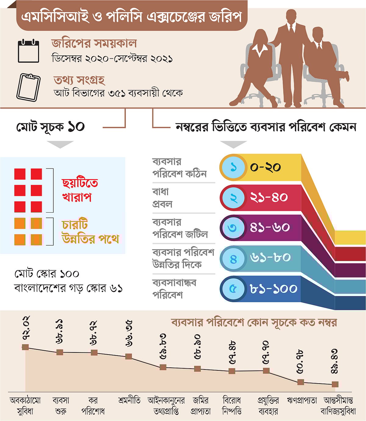 ১০টি সূচকের ওপর ভিত্তি করে ‘বিজনেস ক্লাইমেট ইনডেক্স’ (বিবিএক্স) নামের জরিপটি পরিচালনা করেছে মেট্রোপলিটন চেম্বার অব কমার্স অ্যান্ড ইন্ডাস্ট্রি (এমসিসিআই) এবং পলিসি চেঞ্জ বাংলাদেশ। বাংলাদেশে ১০টির মধ্যে ৬টি সূচকের অবস্থান খারাপ। বাকি ৪টি সূচকে উন্নতির দিকে। ১০টি সূচকের মধ্যে সবচেয়ে ভালো অবস্থানে আছে অবকাঠামো সুবিধা। আর সবচেয়ে খারাপ অবস্থানে আন্তসীমান্ত বাণিজ্যসুবিধা সূচকে। মোট ১০০ স্কোরের মধ্যে বাংলাদেশ পেয়েছে ৬১। গত বছরের ডিসেম্বর থেকে সেপ্টেম্বর সময়ে আটটি বিভাগীয় শহরে ৩৫১ জন ব্যবসায়ীর ওপর জরিপটি করা হয়েছে। গতকাল বৃহস্পতিবার ভার্চ্যুয়াল জরিপে ফলাফল প্রকাশ করা হয়। ব্যবসার পরিবেশ নিয়ে এবারই প্রথমবারের মতো জরিপ করেছে বেসরকারি দুটি সংস্থা।