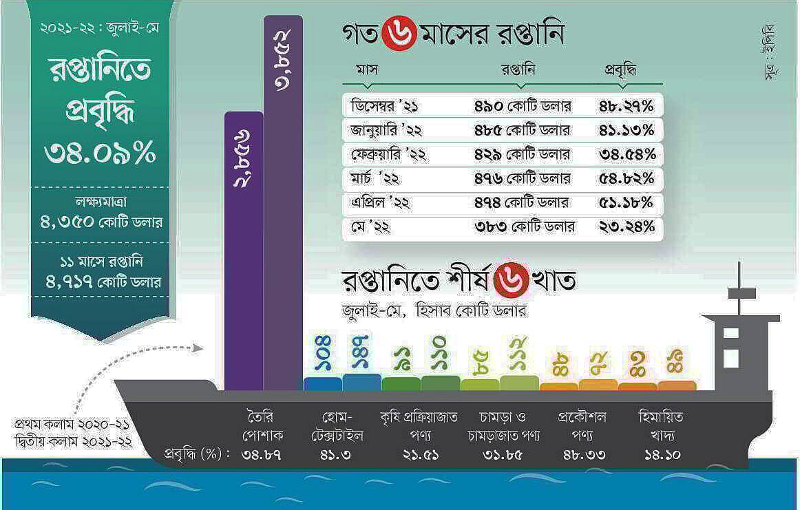 মাসওয়ারি হিসাবে রপ্তানির গতি কমলেও চলতি অর্থবছরের ১১ মাসে সামগ্রিকভাবে পণ্য রপ্তানিতে প্রবৃদ্ধি ভালোই আছে। চলতি ২০২১–২২ অর্থবছরের জুলাই-মে সময়ে ৪ হাজার ৭১৭ কোটি ডলারের পণ্য রপ্তানি হয়েছে। প্রতি ডলারের বিনিময় মূল্য ৮৮ টাকা ৯০ পয়সা হিসাবে দেশীয় মুদ্রায় যার পরিমাণ ৪ লাখ ২৪ হাজার কোটি টাকা। এই আয় গত বছরের একই সময়ের চেয়ে ৩৪ শতাংশ বেশি।