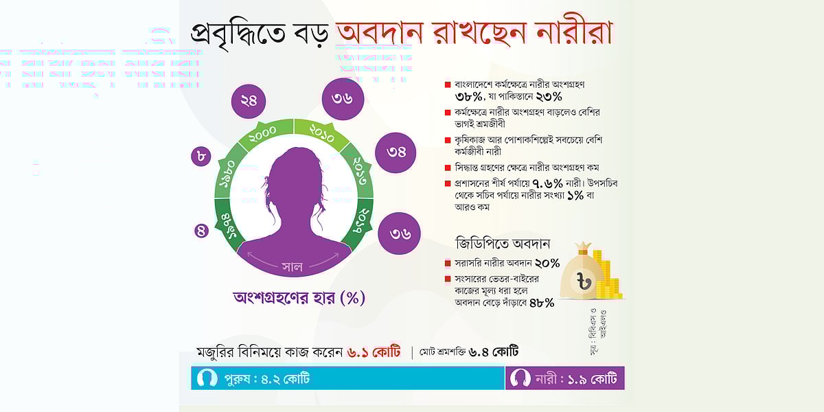 স্বাধীন দেশের শ্রমবাজারে ধীরে ধীরে বেড়েছে নারীর অংশগ্রহণ। তবে শ্রমবাজারে নারীর একটা বড় অংশই অনানুষ্ঠানিক বা নিম্ন আয়ের ও ঝুঁকিপূর্ণ কাজে নিয়োজিত। গত ৫০ বছরে নারীরা দেশের উন্নয়নপ্রক্রিয়ায় গুরুত্বপূর্ণ ভূমিকা পালন করছেন। বেসরকারি গবেষণা সংস্থা সেন্টার ফর পলিসি ডায়ালগের (সিপিডি) গত বছরের এক গবেষণায় বলা হয়, মোট দেশজ উৎপাদনে (জিডিপি) নারীর অবদান প্রায় ২০ শতাংশ। তবে সংসারের ভেতর ও বাইরের কাজের মূল্য ধরা হলে নারীর অবদান বেড়ে দাঁড়াবে ৪৮ শতাংশ। এর অর্থ হলো, দেশের সার্বিক অর্থনৈতিক উন্নয়নে নারী-পুরুষের অবদান বলা যায় সমান সমান। বিবিএসের সর্বশেষ জরিপ অনুযায়ী, ১ কোটি ৮৭ লাখ নারী কৃষি, শিল্প ও সেবা—অর্থনীতির বৃহত্তর এই তিন খাতে কাজ করছেন। তবে উৎপাদনব্যবস্থায় নারীর অংশগ্রহণ বাড়লেও নারী কর্মীদের সিংহভাগই শ্রমজীবী। বাকিরা শিক্ষকতা, চিকিৎসা, ব্যাংকিং, ব্যবসা-বাণিজ্যসহ নানা পেশায় যুক্ত। বিভিন্ন প্রতিষ্ঠানের শীর্ষ নির্বাহীসহ বিভিন্ন উচ্চপদেও দায়িত্ব পালন করছেন নারীরা। তবে শ্রমবাজারে নারীর একটা বড় অংশ অপ্রাতিষ্ঠানিক কাজে নিয়োজিত। যেমন কর্মজীবী নারীদের অর্ধেকের বেশি কৃষিকাজে সম্পৃক্ত। আরেকটি বড় অংশ পোশাকশিল্পে কাজ করে।