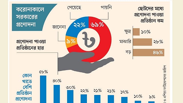 দেশের ব্যবসাপ্রতিষ্ঠানের একটি বড় অংশ করোনাকালে সরকারের দেওয়া সহায়তা পায়নি। বড় প্রতিষ্ঠানের মধ্যে প্রণোদনা পাওয়ার হার বেশি। আবার যেসব খাতের ‘কণ্ঠস্বর জোরালো’, সেসব খাতেই বেশিসংখ্যক প্রতিষ্ঠান প্রণোদনা পেয়েছে।