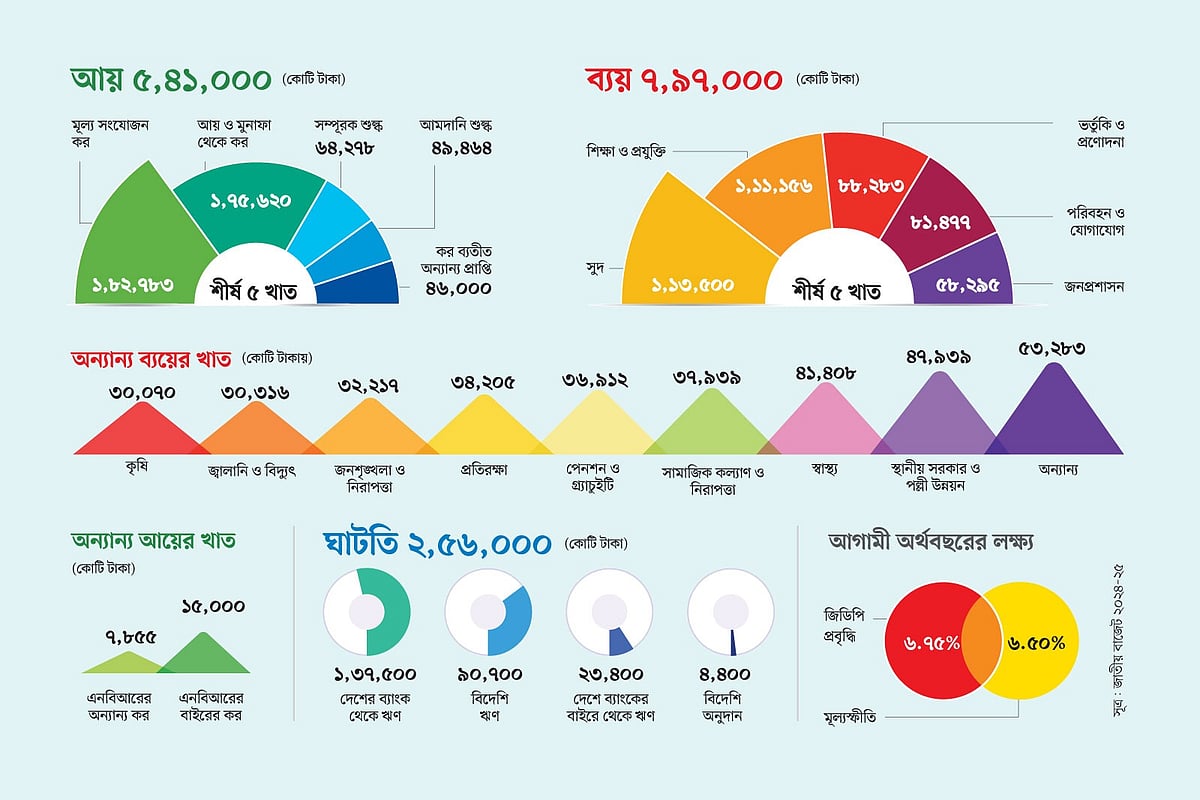 <p>চলতি ২০২৩–২৪ অর্থবছরে <strong>৭,৬১,৭৮৫</strong> কোটি টাকার বাজেট ঘোষিত হলেও সংশোধিত বাজেটে তা কমে <strong>৭,১৪,৪১৮ </strong>কোটি টাকায় দাঁড়ায়। <strong>আগামী ২০২৪–২৫ অর্থবছরের প্রস্তাবিত বাজেটের আয়–ব্যয়ের চিত্র (কোটি টাকা)</strong>।</p>