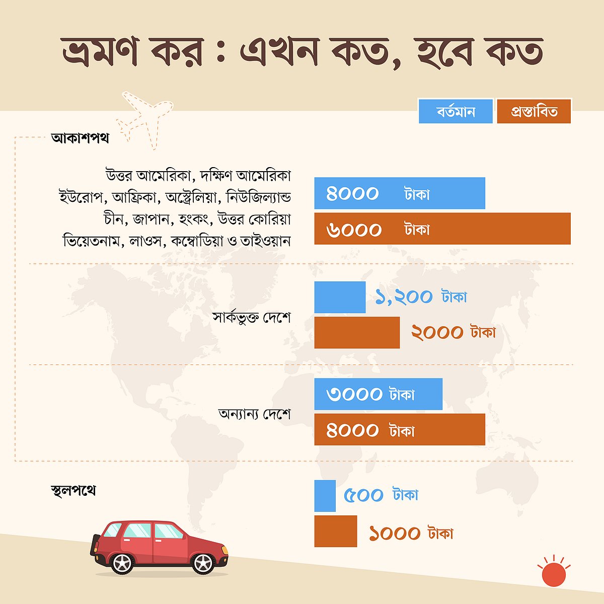 এ ছাড়া আকাশপথে সার্কভুক্ত কোনো দেশে যেতে ভ্রমণকর দিতে হবে ২ হাজার টাকা, বর্তমানে যা ১ হাজার ২০০ টাকা।