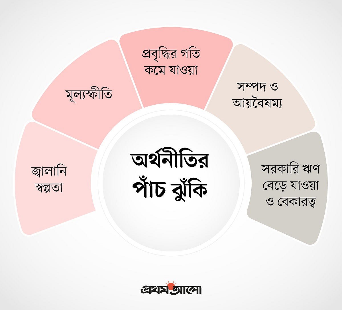 বাংলাদেশের অর্থনীতির জন্য এখন সবচেয়ে বড় ঝুঁকির কারণ জ্বালানিস্বল্পতা। এ কারণে শিল্পোৎপাদন ব্যাহত হচ্ছে। সেই সঙ্গে চলমান উচ্চ মূল্যস্ফীতিও অর্থনীতির জন্য ঝুঁকি তৈরি করছে। অর্থনীতিতে ঝুঁকির অন্যান্য ক্ষেত্র হচ্ছে প্রবৃদ্ধির গতি কমে যাওয়া, সম্পদ ও আয়বৈষম্য এবং সরকারি ঋণ বেড়ে যাওয়া ও বেকারত্ব।