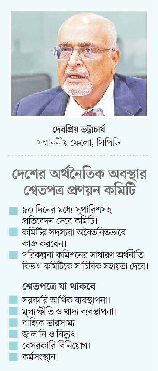বিশিষ্ট অর্থনীতিবিদ ও বেসরকারি গবেষণাপ্রতিষ্ঠান সেন্টার ফর পলিসি ডায়ালগের (সিপিডি) সম্মাননীয় ফেলো দেবপ্রিয় ভট্টাচার্যকে প্রধান করে শ্বেতপত্র প্রণয়ন কমিটি গঠন করেছে প্রধান উপদেষ্টার কার্যালয়। এই কমিটি ৯০ দিনের মধ্যে সুপারিশসহ প্রতিবেদন অন্তর্বর্তী সরকারের প্রধান উপদেষ্টা ড. মুহাম্মদ ইউনূসের কাছে হস্তান্তর করবে।