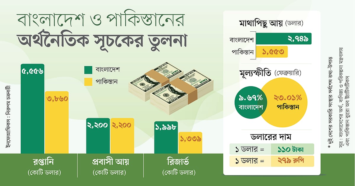 এ ছাড়া রিজার্ভ, ডলারের দাম, রপ্তানি, মূল্যস্ফীতি, মাথাপিছু আয়—অর্থনীতির এসব সূচকেও পাকিস্তানের চেয়ে এগিয়ে আছে বাংলাদেশ। পাকিস্তানের কেন্দ্রীয় ব্যাংকের তথ্য অনুযায়ী, ১৫ মার্চ দেশটির বৈদেশিক মুদ্রার রিজার্ভ ছিল ১ হাজার ৩৩৯ কোটি মার্কিন ডলার। অন্যদিকে আইএমএফের হিসাবপদ্ধতি বিপিএম-৬ অনুযায়ী, গত সপ্তাহ শেষে বাংলাদেশের রিজার্ভ ছিল ১ হাজার ৯৯৮ কোটি ডলার।