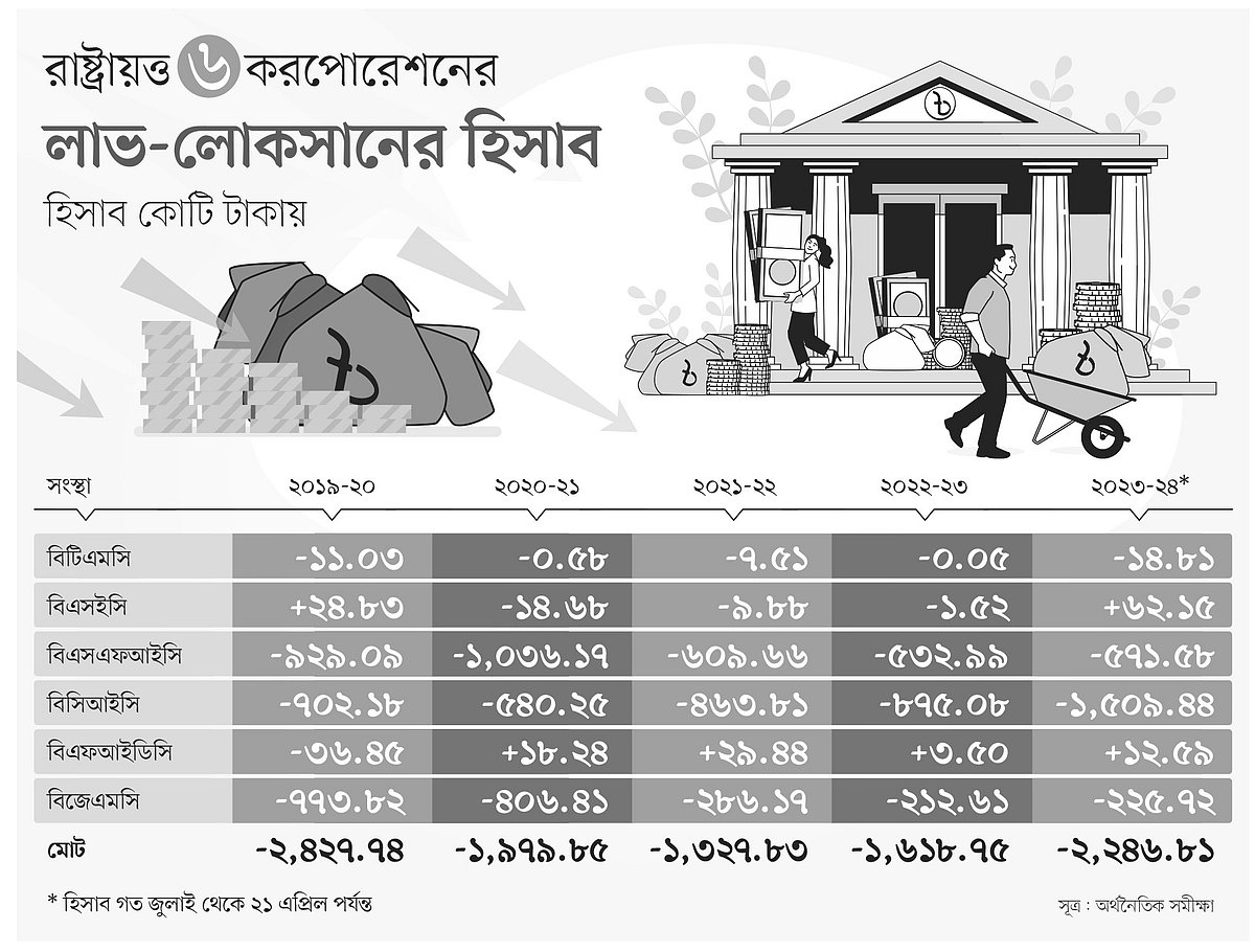 অর্থনৈতিক সমীক্ষার তথ্যানুযায়ী, গত এক যুগে ছয় করপোরেশন ২১ হাজার কোটি টাকা লোকসান গুনেছে। এ সময়ে মাত্র সাড়ে ৫৭ কোটি টাকা লভ্যাংশ বাবদ জমা হয়েছে সরকারের কোষাগারে।