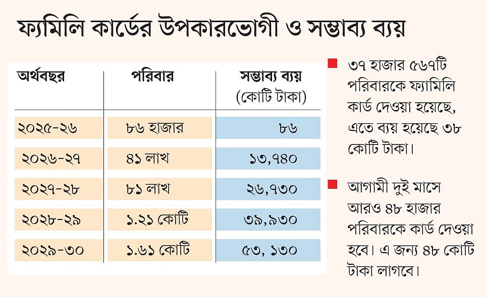 নির্বাচনী ইশতেহারে দেওয়া প্রতিশ্রুতি অনুযায়ী ফ্যামিলি কার্ড দিতে পাঁচ বছরে সরকারের ব্যয় হবে ১ লাখ ৩৪ হাজার কোটি টাকা। এ কার্ডে মাসে ২ হাজার ৫০০ টাকা করে পাবে প্রতিটি নারীপ্রধান পরিবার। প্রতিবছর উপকারভোগীর সংখ্যা বাড়াবে সরকার। বাড়বে তাঁদের জন্য বাজেট বরাদ্দও। অর্থ মন্ত্রণালয়ের অর্থ বিভাগ ও সমাজকল্যাণ মন্ত্রণালয় সূত্রে এ তথ্য জানা গেছে।