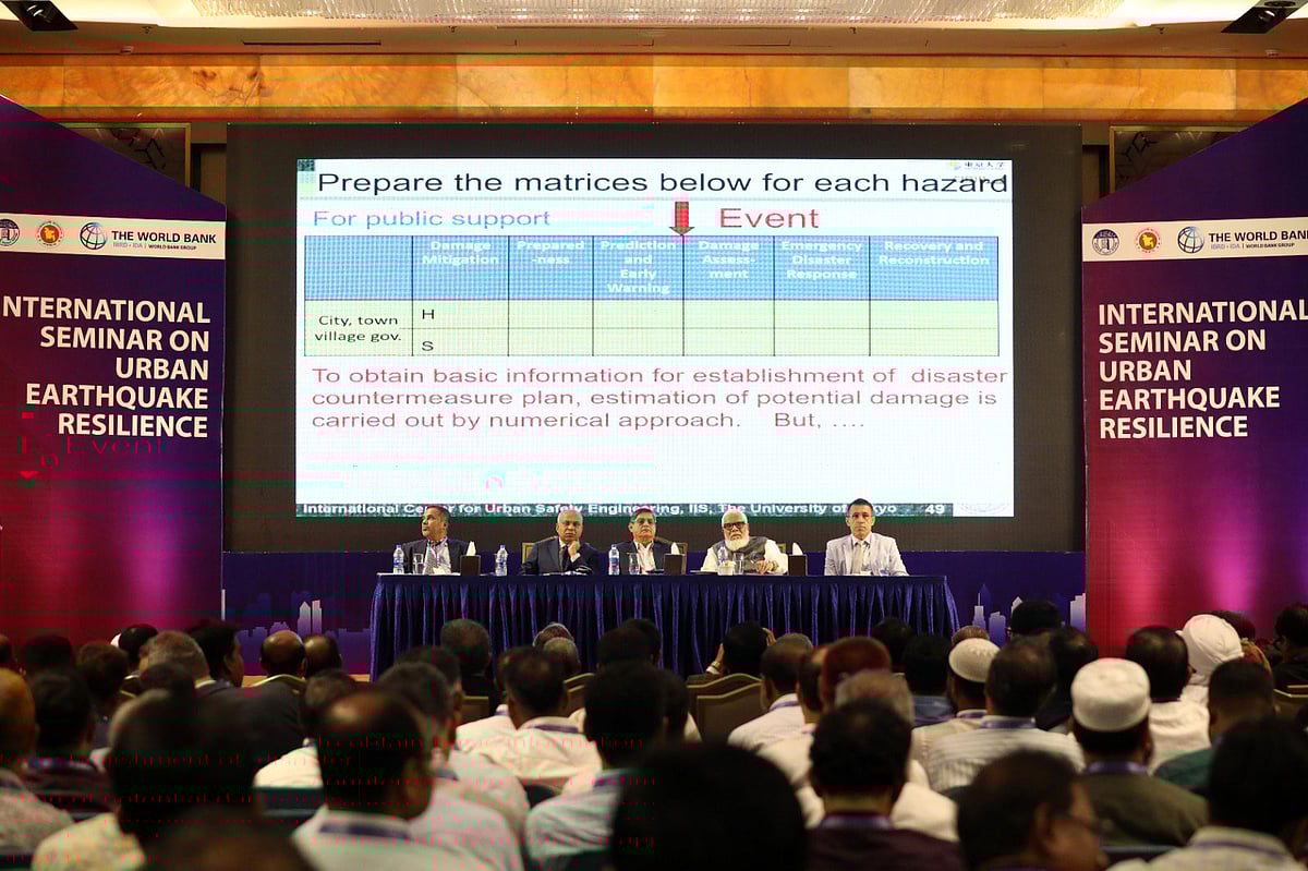 রাজধানীর একটি হোটেলে গত শনিবার শুরু হওয়া এই সেমিনারে প্রধান অতিথি হিসেবে উপস্থিত ছিলেন গৃহায়ণ ও গণপূর্তমন্ত্রী র আ ম উবায়দুল মোকতাদির চৌধুরী। এ সময় আরও উপস্থিত ছিলেন প্রধানমন্ত্রীর বেসরকারি শিল্প ও বিনিয়োগবিষয়ক উপদেষ্টা সালমান এফ রহমান, রাজউক চেয়ারম্যান মো. ছিদ্দিকুর রহমান সরকার। রাজধানী উন্নয়ন কর্তৃপক্ষ (রাজউক) আয়োজিত এই সেমিনার গত রোববার শেষ হয়। ভূমিকম্প নিয়ে সচেতনতা বৃদ্ধি ও তা প্রতিরোধে করণীয় বিষয় তুলে ধরতেই ‘আরবান রেজিলিয়েন্স প্রজেক্ট: রাজউক অংশ’ শীর্ষক প্রকল্পের আওতায় সেমিনারটির আয়োজন করা হয়। প্রকল্প কার্যালয়ের এক সংবাদ বিজ্ঞপ্তিতে বিষয়টি জানানো হয়।