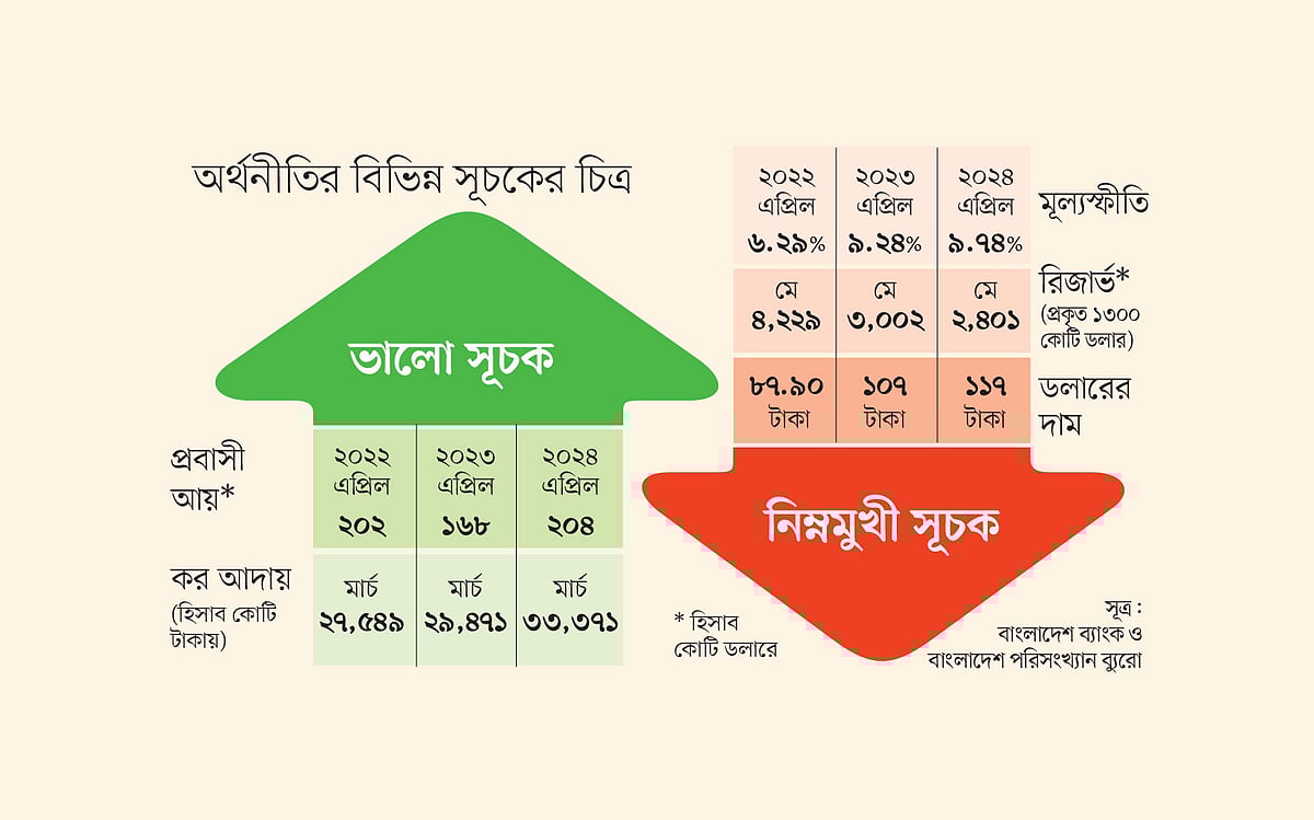 অর্থনীতির বেশির ভাগ সূচক আরও খারাপ হয়েছে। উচ্চ মূল্যস্ফীতি দীর্ঘদিন ধরে বজায় রয়েছে, বেড়েছে মানুষের কষ্ট। ডলার–সংকটে আমদানি কমেছে, যার প্রভাব পড়েছে রপ্তানিতেও। বৈদেশিক মুদ্রার মজুতের পতন থামানো যাচ্ছে না। শুধু ডলারের কারণেই নড়বড়ে হয়েছে অর্থনীতির অনেক সূচক। মূল্যস্ফীতি নিয়ন্ত্রণে কেন্দ্রীয় ব্যাংকের সর্বশেষ পদক্ষেপ বাড়িয়ে দিয়েছে ঋণের সুদ। এসব পদক্ষেপে বেড়েছে ব্যবসা-বিনিয়োগের খরচ।