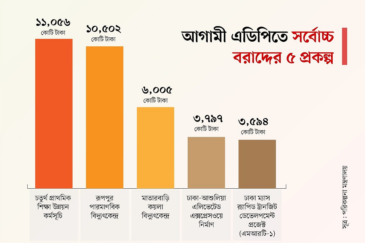এডিপির নথি অনুযায়ী, এই পাঁচটি প্রকল্প হলো চতুর্থ প্রাথমিক শিক্ষা উন্নয়ন কর্মসূচি; রূপপুর পারমাণবিক বিদ্যুৎকেন্দ্র; মাতারবাড়ী কয়লাবিদ্যুৎকেন্দ্র; ঢাকা-আশুলিয়া এলিভেটেড এক্সপ্রেসওয়ে নির্মাণ এবং ঢাকা ম্যাস র্যাপিড ট্রানজিট ডেভেলপমেন্ট প্রজেক্ট (এমআরটি-১)।