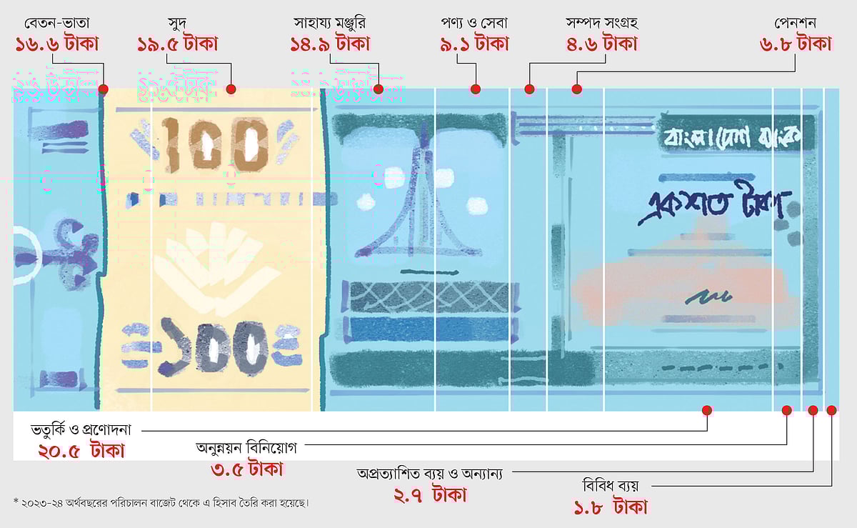 <blockquote>ধরুন আপনি ১০০ টাকা কর দিয়েছেন। এখন দেখা যাক, এবারের বাজেটে এই টাকাটা কোথায় ব্যয় হবে, কারা বেশি পাবেন। যেমন আপনার ১০০ টাকার করের ১৬ টাকা ৬০ পয়সা বেতন হিসেবে পাবেন সরকারি চাকরিজীবীরা</blockquote>