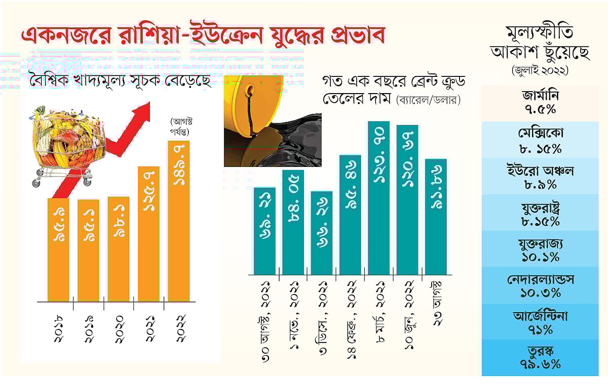 করোনার প্রকোপ থেকে বিশ্ব যখন কেবলই ঘুরে দাঁড়ানোর প্রস্তুতি নিচ্ছিল, ঠিক তখনই রাশিয়া-ইউক্রেন যুদ্ধ শুরু হয়। ফলে বৈশ্বিক অর্থনীতিতে স্থিতিশীলতা আসা তো দূরের কথা, উল্টো পরিস্থিতির আরও অবনতি হয়েছে। অনিশ্চয়তা আবার বাড়তে শুরু করেছে। যুদ্ধের সবচেয়ে বড় প্রভাব দেখা যাচ্ছে জ্বালানির দামে। অপরিশোধিত তেলের দাম গত বছরের শেষ ভাগ থেকেই বাড়তে শুরু করে। যুদ্ধ শুরু হওয়ার পর প্রতিব্যারেল অপরিশোধিত তেলের দাম বেড়ে ১০০ ডলার ছাড়িয়ে যায়, যদিও এখন তা ১০০ ডলারের নিচে রয়েছে।