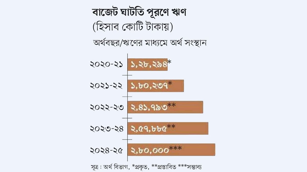 বাজেট তৈরির সময় সরকার ঘাটতির লক্ষ্যমাত্রা প্রায় প্রতি অর্থবছরেই মোট দেশজ উৎপাদনের (জিডিপি) ৫ শতাংশের কিছুটা বেশি রাখে। এবারই এ লক্ষ্যমাত্রা ৫ শতাংশের নিচে রাখা হচ্ছে। তারপরও ঘাটতির পরিমাণ বাড়ছে, যা মেটাতেই বিপুল ঋণ নেওয়ার লক্ষ্য ঠিক করছে সরকার। ঋণের বেশির ভাগ অর্থই আসবে আবার দেশের ব্যাংকব্যবস্থা থেকে। বাজেট প্রণয়নের মূল দায়িত্বে থাকা অর্থ মন্ত্রণালয়ের অর্থ বিভাগ সূত্রে এসব তথ্য জানা গেছে।