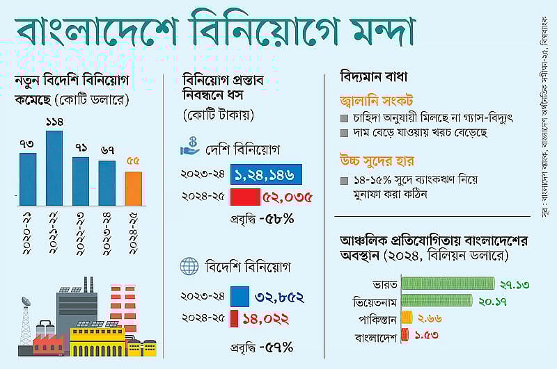 প্রতিযোগী দেশগুলোর চেয়ে সরাসরি বিদেশি বিনিয়োগ (এফডিআই) আনায় পিছিয়ে বাংলাদেশ। অন্তর্বর্তী সরকার বিডার শীর্ষ পদে আশিক চৌধুরীকে আনলেও গত ১৬ মাসে নতুন বিদেশি বিনিয়োগ কমেছে, যা পাঁচ বছরের সর্বনিম্ন। করোনা পরিস্থিতি থেকেও এটি কম। আর্থিক খাতে স্থিতিশীলতা এলেও বিনিয়োগ পরিবেশের উন্নতি হয়নি। গ্যাস-বিদ্যুৎ সংকট, উচ্চ সুদহার ও ব্যবসা পরিচালনার খরচ বৃদ্ধিকে এর কারণ বলছেন বিশেষজ্ঞরা। ভারত, ভিয়েতনাম ও পাকিস্তান বিপুল এফডিআই পেলেও বাংলাদেশ পিছিয়ে।
