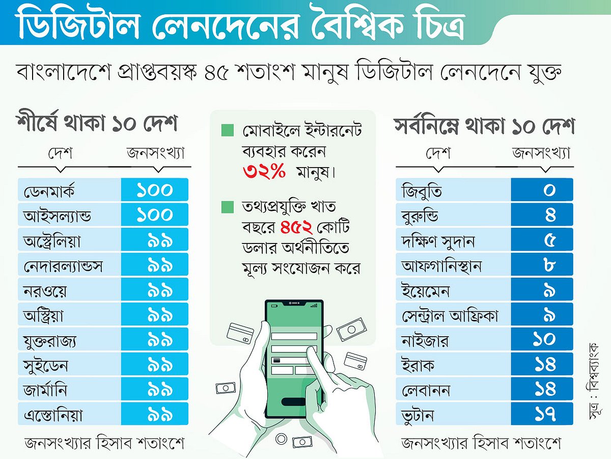 বিশ্বব্যাংক বলছে, বাংলাদেশের ১৫ বছরের বেশি বয়সী জনগোষ্ঠীর ৪৫ শতাংশ ডিজিটাল লেনদেনের সঙ্গে যুক্ত। বাংলাদেশ পরিসংখ্যান ব্যুরোর (বিবিএস) সর্বশেষ জনশুমারি অনুসারে, দেশে ১৫ বছরের বেশি বয়সী মানুষ রয়েছে ১১ কোটি ৮৯ লাখ ১৬ হাজার। বিশ্বব্যাংকের হিসাবে, তাদের মধ্যে ৫ লাখ ৩৫ হাজার মানুষ ডিজিটাল লেনদেন করেন।
