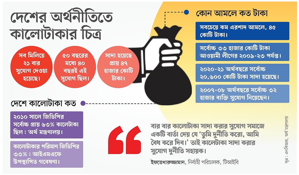 স্বাধীনতার ৫০ বছরে ২১ বার কালোটাকা সাদা করার সুযোগ দেওয়া হয়। তবে সুযোগটি মেলে ৪০ বছর। কিন্তু তেমন সাড়া মেলেনি।