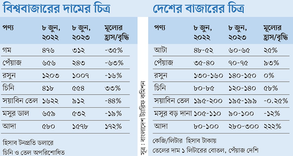 বিশ্ববাজারে কিছু কিছু নিত্যপণ্যের দাম যে হারে বেড়েছে, দেশের বাজারে বেড়েছে তার চেয়ে বেশি। আবার বিশ্ববাজারে কিছু পণ্যের দাম যে হারে কমেছে, দেশের বাজারে সে হারে কমেনি। দু-একটি পণ্যের ক্ষেত্রে বিশ্ববাজারে দাম কমলেও দেশে বাড়তি।