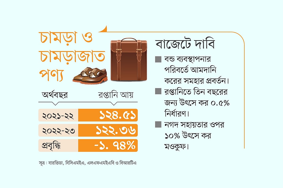 এ ছাড়া চামড়াজাত পণ্য ও জুতা রপ্তানিতে নগদ সহায়তার ওপর ১০ শতাংশ উৎসে কর স্থায়ীভাবে মওকুফ করার প্রস্তাব করেছে সংগঠনটি। তারা বলছে, এ খাতে নগদ সহায়তা আগে ছিল ১৫ শতাংশ। এখন সেটি কমিয়ে করা হচ্ছে ১২ শতাংশ। উৎসে কর কাটার পর রপ্তানিকারকেরা পাবেন ১০ দশমিক ৮ শতাংশ সহায়তা। সরকার নীতিসহায়তার অংশ হিসেবে রপ্তানির জন্য ভর্তুকি দেয়। তাই এ সহায়তার ওপর উৎসে কর কর্তন যৌক্তিক হতে পারে না।