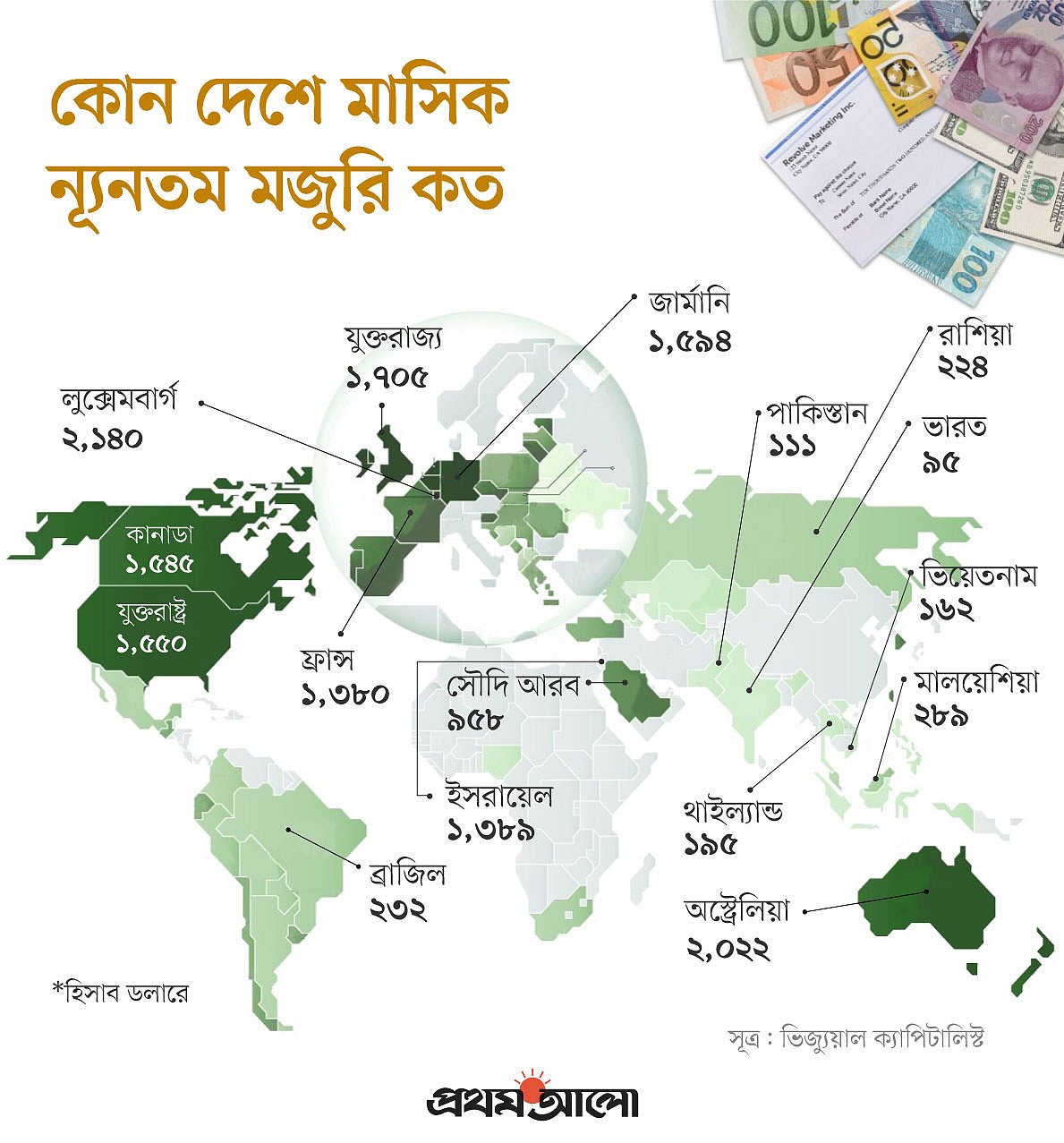 দেখা যাক বিশ্বের বিভিন্ন দেশে কত মজুরি দেওয়া হয়। ভিজ্যুয়াল ক্যাপিটালিস্টের হিসাবে, বিশ্বে সবচেয়ে বেশি মজুরি দেওয়া হয় ইউরোপের দেশ লুক্সেমবার্গে—মাসিক ২ হাজার ১৪০ ডলার। এরপর দ্বিতীয় স্থানে আছে অস্ট্রেলিয়া, সে দেশের জাতীয় ন্যূনতম মজুরি ২ হাজার ২২ ডলার।