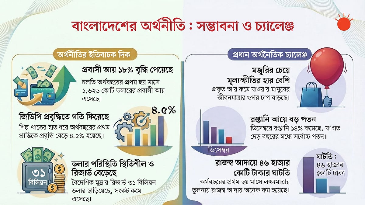 চলতি অর্থবছরের অর্ধেক পেরিয়ে গেছে। বর্তমান অন্তর্বর্তী সরকার বিভিন্ন সংস্কার উদ্যোগ নেওয়ার পরও অর্থনীতিতে এখনো নানা চ্যালেঞ্জ বিদ্যমান। সামনে জাতীয় নির্বাচন। নতুন সরকার এসে কেমন অর্থনীতি পাবে, তা নিয়ে জল্পনা–কল্পনা শুরু হয়েছে। এখনো মূল্যস্ফীতির চাপ কমেনি। ট্রাম্পের পাল্টা শুল্কের কারণে চাপে পড়েছে রপ্তানি খাত। তবে প্রবাসী আয় চাঙা আছে। রাজস্ব আদায় কাঙ্ক্ষিত হারে হচ্ছে না। চ্যালেঞ্জ আছে বিনিয়োগ ও কর্মসংস্থানে। তাহলে প্রশ্ন–উত্তর পর্বের মাধ্যমে জেনে নিই কেমন আছে মানুষ, কেমন আছে অর্থনীতি।