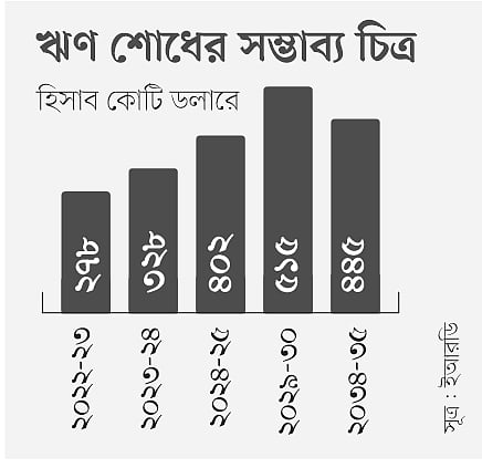 অর্থনৈতিক সম্পর্ক বিভাগ (ইআরডি) সূত্রে জানা গেছে, চলতি ২০২২-২৩ অর্থবছরের প্রথম ৬ মাসে ১১২ কোটি ডলার ঋণ পরিশোধ করা হয়েছে। ছয় মাসে এত ঋণ পরিশোধ আগে কখনোই হয়নি। সামনে আরও বেশি ঋণ পরিশোধ করতে হবে—এমন পূর্বাভাসও মিলেছে ইআরডির এক প্রতিবেদনে। নতুন ঋণ চুক্তি না হলে এবং শুধু পাইপলাইনে থাকা প্রতিশ্রুতি থেকে ঋণ মিললে এবং ডলারে আগামী কয়েক বছরে ঋণ পরিশোধে কী পরিমাণ অর্থ খরচ করতে হবে, তা দেখানো হয়েছে ওই প্রতিবেদনে। প্রতিবেদন অনুযায়ী, চলতি অর্থবছরে সব মিলিয়ে ২৭৮ কোটি ডলার পরিশোধ করতে হবে। প্রতিবছরই এ পরিমাণ বাড়বে। ২০২৪-২৫ অর্থবছরে তা বেড়ে দাঁড়াবে ৪০২ কোটি ডলার। ২০২৯-৩০ অর্থবছরে ঋণ পরিশোধে সর্বোচ্চ ৫১৫ কোটি ডলার খরচ হবে। এরপর ঋণ পরিশোধ কমতে থাকবে।