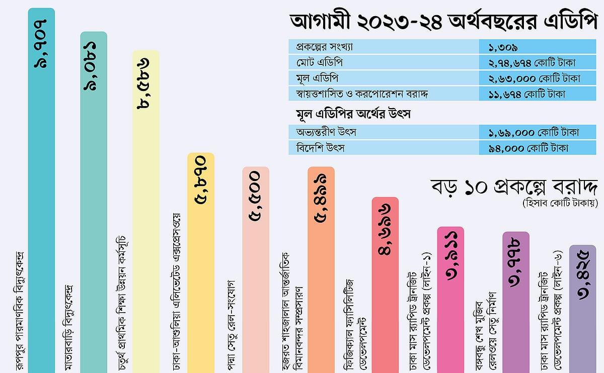 সরকারের আগামী ২০২৩–২৪ অর্থবছরের উন্নয়ন কর্মকাণ্ডে দেশের বৃহৎ প্রকল্পগুলোকে বেশি গুরুত্ব দেওয়া হচ্ছে। বড় ১০টি প্রকল্পেই মোট এডিপির ২৩ শতাংশ অর্থ বরাদ্দ করা হয়েছে। এই ১০ প্রকল্পে সব মিলিয়ে বরাদ্দ করা হয়েছে ৬০ হাজার ৫১ কোটি টাকা।