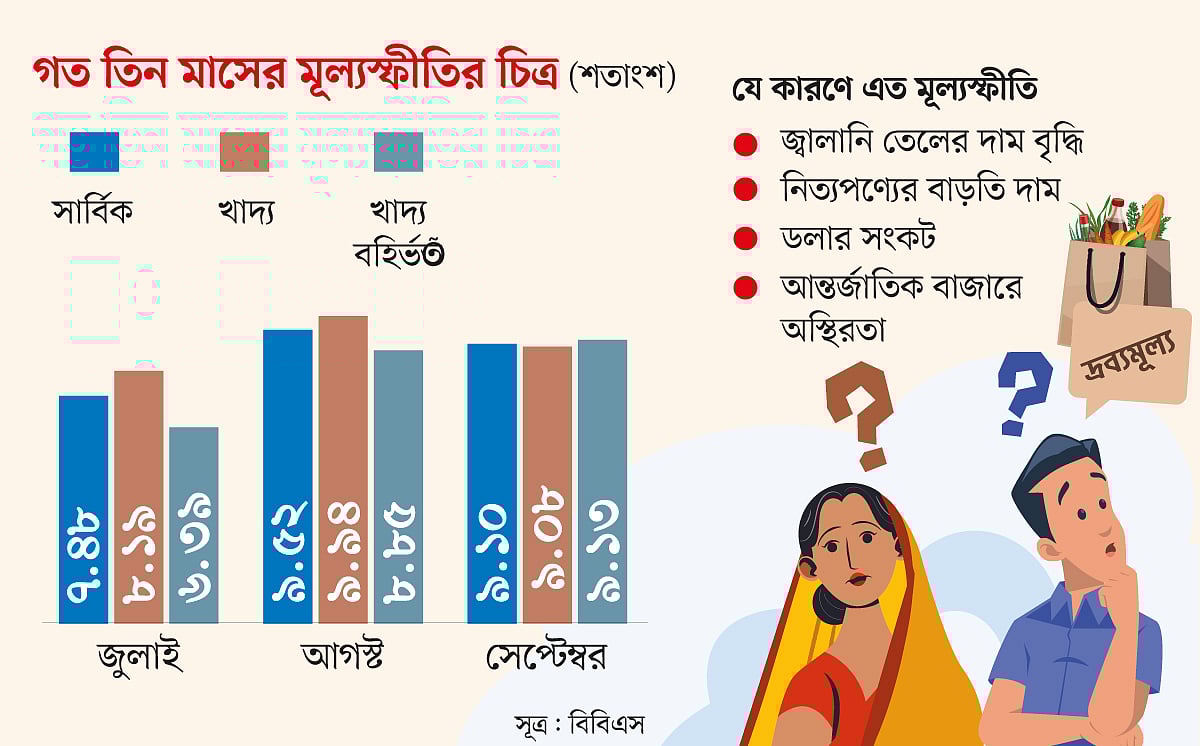 গত সেপ্টেম্বর মাসে খাদ্য ও খাদ্যবহির্ভূত—দুই ক্ষেত্রেই মূল্যস্ফীতি ৯ শতাংশের বেশি হয়েছে। শঙ্কার বিষয় হলো, সেপ্টেম্বর মাসে খাদ্যের চেয়ে খাদ্যবহির্ভূত পণ্যের মূল্যস্ফীতির হার বেশি। গত মাসে খাদ্যপণ্যে মূল্যস্ফীতি ৯ দশমিক ৯২ শতাংশ থেকে কমে ৯ দশমিক শূন্য ৮ শতাংশ হয়েছে। অন্যদিকে খাদ্যবহির্ভূত পণ্যের মূল্যস্ফীতি আগস্ট মাসের ৮ দশমিক ৮৫ শতাংশ থেকে বেড়ে ৯ দশমিক ১৩ শতাংশ হয়েছে।